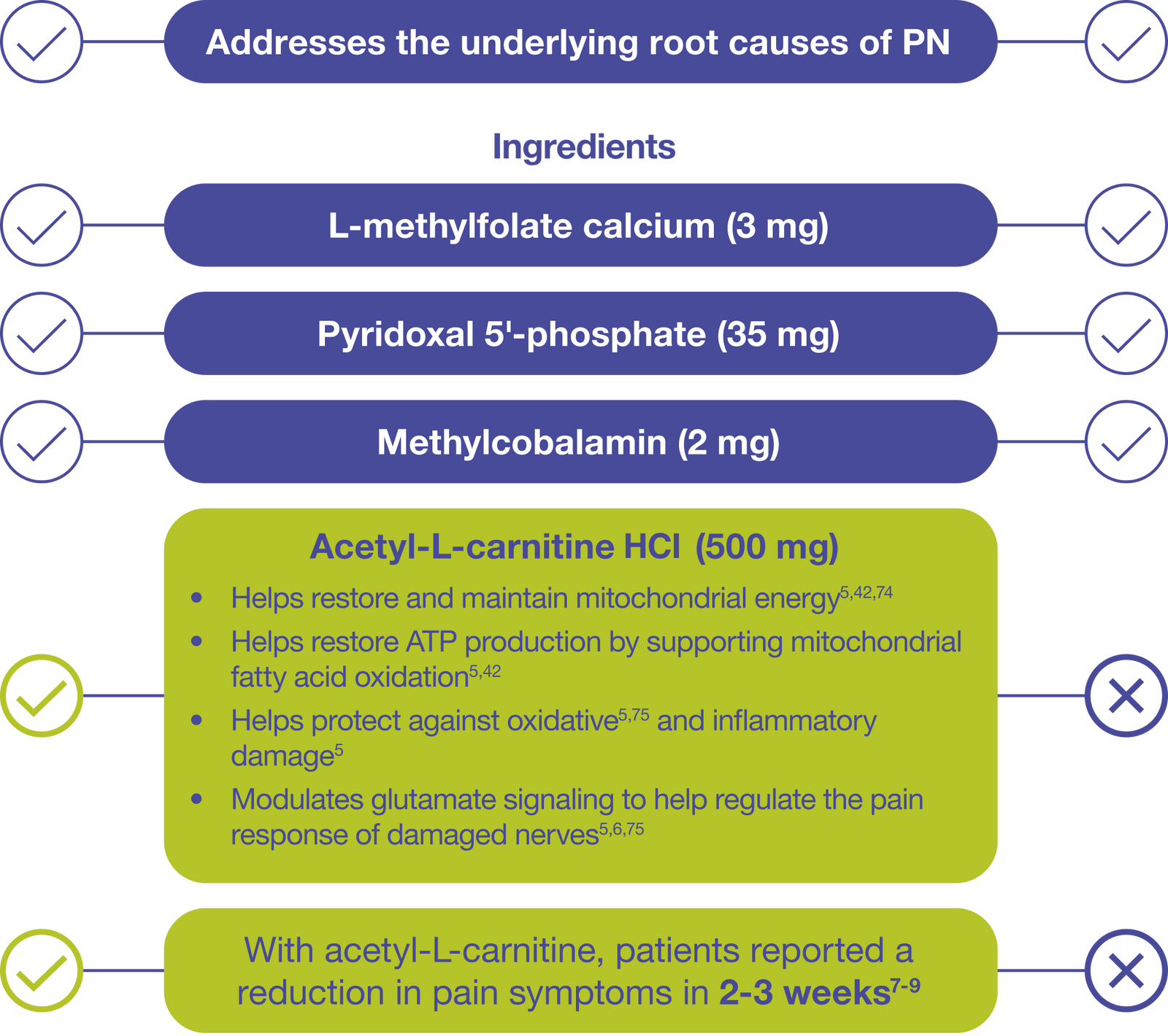 † Clinical studies on a formulation of METANX—which contained the same levels of L-methylfolate, pyridoxal 5'-phosphate, and methylcobalamin as in MetanxPRO Nerve Health™—demonstrated sustained improvements in pain, sensory symptoms, and quality of life in patients with diabetic peripheral neuropathy (DPN, the most common form of peripheral neuropathy).